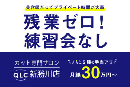 残業ゼロ!|月給30万円〜+歩合有◎|カット専門|手荒れなし|練習会なし|プライベートも大切にできる美容師ライフをQLCで。